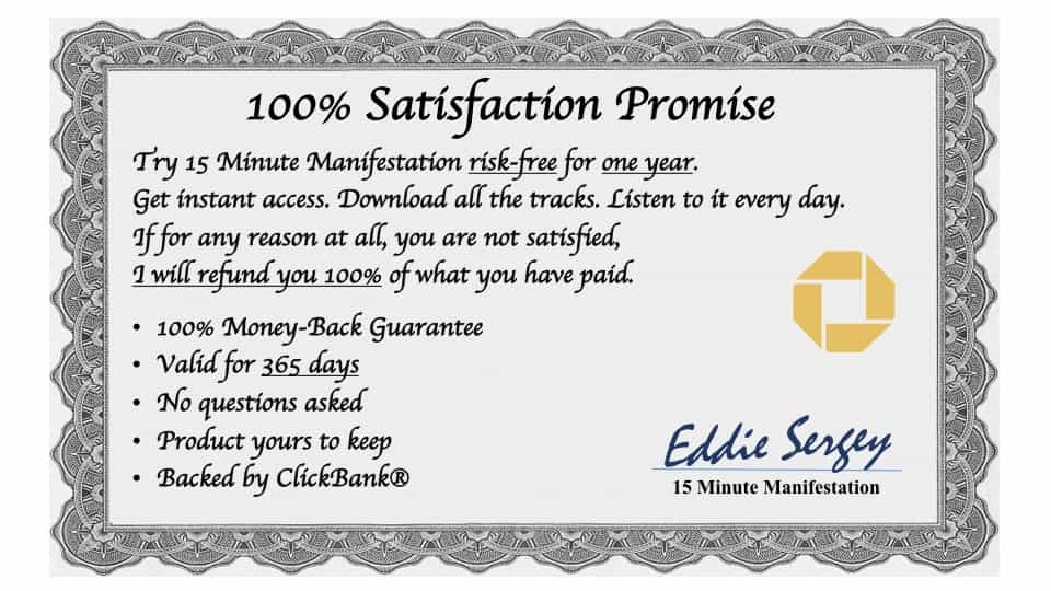As I mentioned previously, 15-Minute Manifestation also comes with a 365 day, no questions asked, money back guarantee. You have nothing to lose and so much to gain.